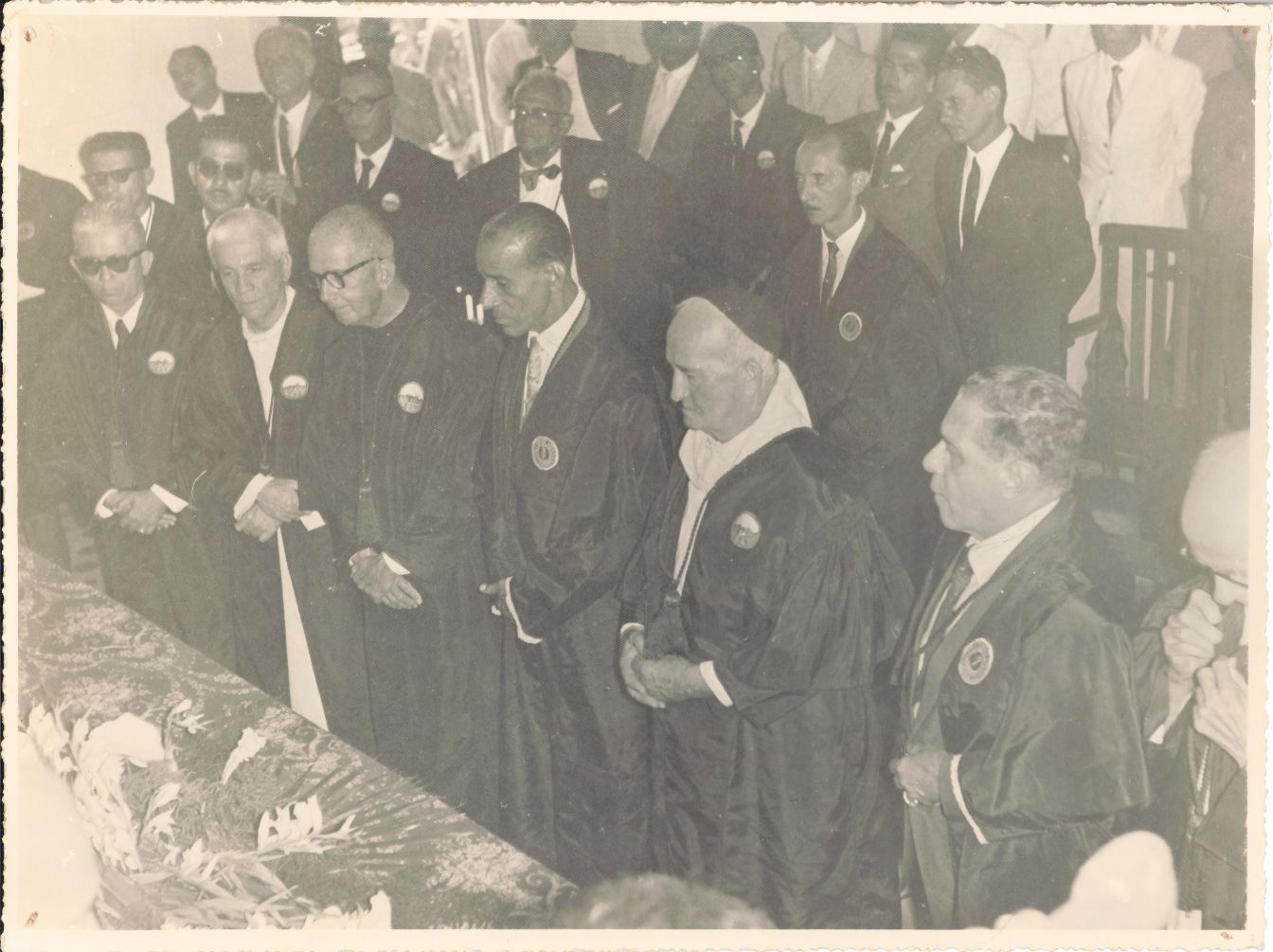 Revela a Solenidade comemorativa do Jubileu de Ouro da Escola Superior de Agricultura da Universidade Rural de Pernambuco - URP, realizada nas antigas instalações da Escola Superior de Agricultura - ESA, localizada nas instalações do Engenho São Bento, no município de São Lourenço da Mata, Pernambuco, em 03 de novembro de 1962. A equipe do reitorado do professor Renato Ramos de Farias coordenou e realizou as festividades que emocionaram a comunidade universitária e os Monges Beneditinos que propiciaram os primeiros passos dessa Instituição de Ensino Superior. Para fazer esse clique fotográfico com a finalidade de guardar para a posteridade, o fotógrafo se posicionou no início do salão, de frente para a mesa diretora da solenidade devidamente ornamentada com toalha e arranjo floral, composta pelo professor Renato Ramos de Farias, sentado no centro, vestindo a beca, veste talar ou traje oficial própria da vestimenta do Cerimonial Universitário, usado pelo reitor nas solenidades oficiais. No ângulo lateral esquerdo da fotografia, encontra-se o Dom Pedro Penido O.S.B., Abade do Mosteiro de São Bento de Olinda, Pernambuco, vestindo sua batina branca, traje usado nas cerimônias oficiais. Ao seu lado direito, encontra-se o professor Humberto Venet, diretor da Escola Superior de Medicina Veterinária, trajando terno e camisa brancos com gravata escura, usa óculos e sobre esse traje usa a beca, vestimenta do Cerimonial Universitário, usado pelos conselheiros nas solenidades oficiais. À sua esquerda, está sentada a senhora Maria de Lourdes Penante Neiva, secretária da Reitoria. No ângulo lateral direito, aparece sentado o professor João de Vasconcelos Sobrinho, docente da ESA, vestindo terno e camisa brancos com gravata poá, usa óculos e sobre esse traje usa a beca, vestimenta do Cerimonial Universitário, usado pelos conselheiros nas solenidades oficiais e tem nas mãos seu discurso, contudo, fala naturalmente e de improviso. Vê-se também sentado ao seu lado direito, Dom Pedro Bandeira de Melo, O.S.B., professor e ex-diretor da ESA, sobre a batina, usa a beca, vestimenta do Cerimonial Universitário, usado pelos conselheiros nas solenidades oficiais e está com as mãos cruzadas e usa óculos. Ainda nesse ângulo lateral direito da fotografia, ao lado esquerdo do professor João de Vasconcelos Sobrinho, está sentado o professor Mário Bezerra de Carvalho, usando terno e camisa brancos com gravata escura, usa óculos e sobre esse traje usa a beca, vestimenta do Cerimonial Universitário, usado pelos conselheiros nas solenidades oficiais. Ainda nesse mesmo ângulo, encontra-se sentada uma autoridade eclesiástica vestindo batina também chamada sotaina escura e sobre a cabeça um barrete. A seguir está sentado o professor Jair Meirelles, ao seu lado está sentado o professor Augusto Chaves Batista, ambos também usam a beca, vestimenta do Cerimonial Universitário, usado pelos conselheiros nas solenidades oficiais. Em seguida ao registro de todos os membros da mesa diretora, a objetiva captou parte do auditório que estava de costas para ele. Vê-se no ângulo lateral direito uma porta escura fechada, em cuja parte superior há uma grade antiga trabalhada. Vê-se presas à parede posterior aos membros da mesa diretora, a bandeira do Brasil e a bandeira de Pernambuco. NOTA IMPORTANTE: As Escolas Superiores de Agricultura e Veterinária São Bento, idealizadas pelo Abade D. Pedro Rooser O.S.B. e demais Monges Beneditinos do Mosteiro de São Bento, localizado em Olinda, Pernambuco, foram fundadas em 03 de novembro de 1912. Instaladas, inicialmente, no prédio anexo ao Mosteiro, iniciaram as aulas do primeiro semestre dos cursos de Agronomia e Veterinária no dia 1º de fevereiro de 1914. Em 1917, a Escola de Agricultura em virtude da necessidade de áreas para aulas práticas e campos de cultura, foi renomeada para Escola de Agronomia “São Bento” - ESA e transferida para o interior do Estado, passado a funcionar no Engenho São Bento, de propriedade da Ordem Beneditina da Ordem Beneditina, localizado no município de São Lourenço da Mata a oito quilômetros da Estação Tapera. Enquanto isso, a Escola Superior de Veterinária, continuou funcionando, ao lado do Mosteiro, em Olinda, contudo em virtude da falta de demanda, deixou de funcionar em 1926. Ambas as Escolas são a célula Mater da Universidade Federal Rural de Pernambuco - UFRPE. FONTE DE PESQUISA: Informações escritas a caneta no verso da fotografia; PESQUISA COMPLEMENTAR: BURKE, Peter. Testemunha ocular: o uso de imagens como evidência histórica. São Paulo: Editora Unesp, 2017; GOMES, Simone. Cerimonial da UFRPE. Depoimento oral concedido à bibliotecária Conceição Martins em 15 de setembro de 2023; UNIVERSIDADE RURAL DE PERNAMBUCO. Plaquete comemorativa do cinquentenário da Escola Superior de Agricultura da Universidade Rural de Pernambuco: 1912-1962. Recife: Imprensa Universitária URP, 1962; ______. Plaquete oitenta anos dos cursos das Ciências Agrárias: 1912-1992. Recife: Imprensa Universitária URP, 1994.