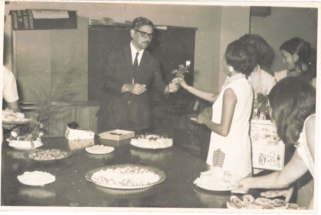 | dc.description.abstractx | Registra a continuação da comemoração do aniversário do Reitor realizada no Departamento de Economia Doméstica no ano de 1969. Vê-se o reitor Adierson Erasmo de Azevedo, o aniversariante iniciando a entrega de rosas às mulheres presentes, entregando a primeira rosa à Maria Clara, bibliotecária da Biblioteca Central da UFRPE, vendo- se também outras 02 representantes femininas da sua equipe de trabalho que se dirigem para cumprimenta-lo, assim como aparece no lado direito, mais uma mulher organizando os pratos sobre a mesa. Observa-se que do lado esquerdo da sala atrás do reitor, há alguns armários e sobre um deles encontram-se alguns cartazes. Há também uma espécie birô ou mesa. Nesse lado, aparece o braço de alguém não identificado. Durante a entrevista para rememoração, ao observar a fotografia, o reitor Adierson falou: “Eita, já se passaram muitos anos! Vamos ver se minha memória ajuda.... Aqui estou eu e minha esposa, Líbia e meu filho caçula, Adierson Filho... Vejo Dona Lilia, a secretária da reitoria ... aqui é a Dona Lourdes Dantas Ferreira, a tesoureira do Departamento Financeiro; Mauro Lins Galvão; Lucia Medeiros ... Tá beleza! (Observando…). Olha Apulcro aqui.... Os outros não dá para lembrar os nomes. ” FONTES DE PESQUISA: Entrevista concedida às bibliotecárias Conceição Martins e Vania Ferreira para atender aos objetivos do Repositório Institucional, projeto “(Re) Memórias da UFRPE”, para a contextualização das imagens do acervo fotográfico do reitorado do Prof. Dr. Adierson Erasmo de Azevedo, no período de dezembro de 1969 a agosto de 1973. Acervo localizado no Núcleo do Conhecimento Professor João Baptista Oliveira dos Santos, da Biblioteca Central da UFRPE. Entrevista realizada no dia 29 de abril de 2016, no Espaço Santander da Biblioteca Central da UFRPE. Duração de 2h24min com transcrição da bibliotecária Conceição Martins. | |