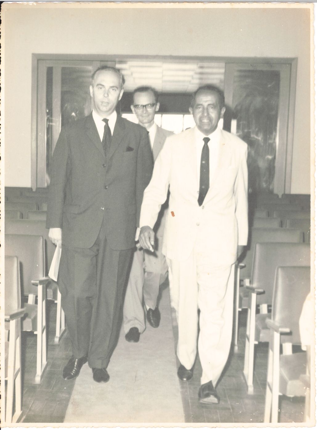 Revela o sexto registro fotográfico da recepção do reitor Renato Ramos de Farias à comitiva dos docentes da Escola de Medicina Veterinária da Universidade de Hanover, Alemanha, no ano de 1962. Vê-se o flagrante da entrada do reitor da UFRPE acompanhado pelos professores alemães no salão nobre da UFRPE. Vendo-se o reitor que sorri enquanto caminha trajando terno claro, camisa branca, gravata de cor escura e sapatos pretos, tendo ao seu lado direito, o professor de nome não foi identificado que fala algo enquanto anda vestindo terno escuro, camisa branca, gravata escuras e sapatos pretos. Seguidos pelo outro professor alemão também de nome não foi identificado que esboça um sorriso, usa terno de cor clara, gravata escura, óculos e sapatos pretos. Para realizar esse clique fotográfico, o fotógrafo se posicionou de costas para o salão nobre, de frente para as autoridades fato que possibilitou captar a imagem da recepção e da porta de acesso ao mencionado salão e de parte de algumas poltronas que o compõem. FONTE DE PESQUISA: Informações escritas a lápis no verso da fotografia. PESQUISA COMPLEMENTAR: BURKE, Peter. Testemunha ocular: o uso de imagens como evidência histórica. São Paulo: Editora Unesp, 2017; MANINI, Miriam Paula. Imagem, memória e informação: um tripé para o documento fotográfico. Domínios da Imagem, Londrina, ano IV, n. 8, p. 77-88, maio 2011; UNIVERSIDADE FEDERAL RURAL DE PERNAMBUCO. Plaquete comemorativa dos setenta anos de Medicina Veterinária em Pernambuco: (1912-1982). Recife: UFRPE, 1982.