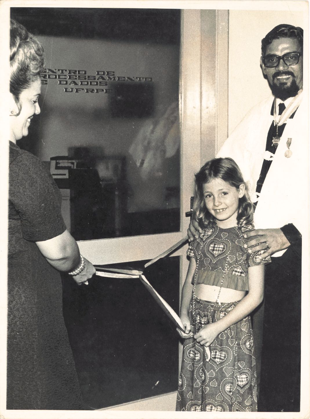Registra o momento da inauguração oficial do Centro de Processamento de Dados da UFRPE, cujo local e o ano não foram identificados. Diante disso, colocou-se como data aproximada o ano de 1970. Vê-se o reitor usando a samarra, traje talar utilizado nas solenidades oficiais da universidade. Ele encontra-se posicionado no lado direito da foto, sorrindo e tendo à sua frente, uma garotinha também sorridente segurando uma ponta da fita da inauguração. Do lado esquerdo aparece uma mulher sorrindo, olhando para a garotinha e também segurando o outro extremo da mesma fita. Durante a entrevista para rememoração, o reitor Adierson falou: “Esse Centro de Processamento de Dados foi um dos mais modernos aqui no estado... Eu estava usando o traje que o reitor usa durante as solenidades e essa inauguração era um evento muito importante para a Rural. Vejam, eu estava muito feliz mesmo, dá para ver pelo meu sorriso! ... (observando pensativo), infelizmente, quando saí da reitoria esse Centro foi extinto, é danado, não é? Isso é o que mais acontece no Brasil uma administração cria algo de bom e a que lhe sucede não quer nem saber, chega e acaba... (Observando)... Essa garotinha não é minha filha. Acho que era filha dessa senhora que aparece, mas que agora não lembro o nome...” FONTES DE PESQUISA: Entrevista concedida às bibliotecárias Conceição Martins e Vania Ferreira para atender aos objetivos do Repositório Institucional, projeto “(Re) Memórias da UFRPE”, para a contextualização das imagens do acervo fotográfico do reitorado do Prof. Dr. Adierson Erasmo de Azevedo, no período de dezembro de 1969 a agosto de 1973. Acervo localizado no Núcleo do Conhecimento Professor João Baptista Oliveira dos Santos, da Biblioteca Central da UFRPE. Entrevista realizada no dia 27 de abril de 2016, no Espaço Santander da Biblioteca Central da UFRPE. Duração de 2h17min com transcrição e pesquisa complementar da bibliotecária Conceição Martins.
