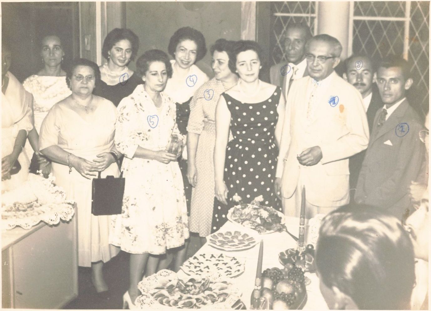 Imagem relativa à recepção oferecida pelo reitor Manuel Rodrigues Filho em sua residência, aos concluintes do Curso de Medicina Veterinária do ano de 1959, que o homenagearam com a escolha do seu nome para Paraninfo. Participam da festa professores, servidores, convidados e formados, todos diante de uma mesa ricamente ornamentada, era época natalina, contendo diversos pratos doces, salgados e frutas. Nessa imagem, vê-se no ângulo lateral direito da fotografia, o reitor diante da mesa, trajando branco, olhando adiante, tendo ao lado direito dois homens não identificados e atrás de si, o professor Artur Lopes Pereira, reitor do período de 1967 a 1969. Ao lado direito do professor Manuel Rodrigues Filho, está sua esposa, senhora Eunice Borges Rodrigues, trajando vestido poá complementado por colar de pérolas com duas voltas, cabelos curtos, olhando para as pessoas que estão do outro lado da mesa. Posam ao lado da senhora Eunice Rodrigues, Maria de Lourdes Penante, secretária da Reitoria; Dagmar Siqueira de Carvalho, secretária da Escola Superior de Veterinária; Hilda Magariños de Souza Leão, secretária da Universidade Rural de Pernambuco e a esposa do professor Cláudio Selva, de nome não identificado. A turma de 1959 era composta pelos seguintes alunos: Ariovaldo Torres, Geraldo Andrade Teixeira, Geraldo Fernando Saboya, Herman de Moreira Albuquerque, José Cassemiro de Lima Albuquerque, João Fernando de Carvalho, Joaquim Berdor Jardim, Leônidas Espírito Santos Saraiva, Moysés Castanha Accioly, Nélson Dutra Buarque, Onildo Travassos de Medeiros, Pedro Chaves Nunes, Rosael Paes Barreto Pereira e Valfredo Cordeiro de Albuquerque. Na fotografia não foi possível identificar nenhum deles. FONTE DE PESQUISA: BOLETIM DA UNIVERSIDADE RURAL DE PERNAMBUCO. Recife: Imprensa da Universidade Rural e Pernambuco, n. 9, 1959. Trimestral. UNIVERSIDADE FEDERAL RURAL DE PERNAMBUCO. Setenta anos de Medicina Veterinária em Pernambuco (1912-1982). Recife: Editora da UFRPE, 1982. PESQUISA COMPLEMENTAR: PISANESCHI, PISANESCHI, Lucilene Schunck C.; BAUER, Viviane Freitas Carlos. A imagem da história: o uso da documentação iconográfica e historiográfica. São Paulo: Amazon & Independently published, 2021. E-book.