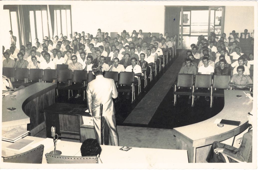 Fotografia que registra a conferência do reitor Adierson Erasmo de Azevedo para os estudantes da UFRPE, realizada no salão nobre da UFRPE, vendo-se o reitor de pé, de frente para o público que lota o salão nobre e de costas para o fotógrafo. Pode-se observar ainda que nas bancadas destinadas aos membros do Conselho Universitário aparecem pequenos detalhes tais como mãos, antebraço, cabeça e perfil de alguns desses Conselheiros presentes no evento. Durante a rememoração, o reitor após olhar com atenção comentou: “O Salão estava lotado, tinha muita gente... o público é jovem, certamente eram estudantes. Falando para os estudantes, mas não tem a data e não consigo lembrar”. FONTES DE PESQUISA: Entrevista concedida às bibliotecárias Conceição Martins e Vania Ferreira para atender aos objetivos do Repositório Institucional, projeto “(Re) Memórias da UFRPE”, para a contextualização das imagens do acervo fotográfico do reitorado do Prof. Dr. Adierson Erasmo de Azevedo, no período de dezembro de 1969 a agosto de 1973. Acervo localizado no Núcleo do Conhecimento Professor João Baptista Oliveira dos Santos, da Biblioteca Central da UFRPE. Entrevista realizada no dia 13 de abril de 2016, no Espaço Santander da Biblioteca Central da UFRPE. Duração de 2h40min com transcrição e pesquisa complementar da bibliotecária Conceição Martins. AZEVEDO, Adierson Erasmo de. A “Caminhada seguindo o Sol” da Universidade Federal Rural de Pernambuco. Recife: Editora UFRPE, 2007.