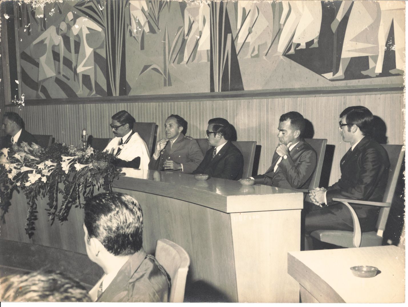 Essa Fotografia, ao lado das de números 29 e 30, integra um conjunto que retrata uma solenidade de formatura, realizada no salão nobre da UFRPE, vendo-se detalhes do painel de Lula Cardoso Ayres, criado especificamente para compor a decoração desse ambiente. Registra parte dos componentes da mesa diretora, vendo-se o reitor Adierson Erasmo de Azevedo ao centro e a presença de 04 autoridades, entre ela, sentado em 3º lugar, à esquerda, o engenheiro agrônomo e presidente da Federação da Agricultura de Pernambuco, Hélvio Azevedo de Queiroz, fato que levou o reitor durante sua rememoração, a levantar a possibilidade de ser a formatura, do curso de Agronomia. FONTES DE PESQUISA: Entrevista concedida às bibliotecárias Conceição Martins e Vania Ferreira para atender aos objetivos do Repositório Institucional, projeto “(Re) Memórias da UFRPE”, para a contextualização das imagens do acervo fotográfico do reitorado do Prof. Dr. Adierson Erasmo de Azevedo, no período de dezembro de 1969 a agosto de 1973. Acervo localizado no Núcleo do Conhecimento Professor João Baptista Oliveira dos Santos, da Biblioteca Central da UFRPE. Entrevista realizada no dia 13 de abril de 2016, no Espaço Santander da Biblioteca Central da UFRPE. Duração de 2h40min com transcrição e pesquisa complementar da bibliotecária Conceição Martins. AZEVEDO, Adierson Erasmo de. A “Caminhada seguindo o Sol” da Universidade Federal Rural de Pernambuco. Recife: Editora UFRPE, 2007. Os detalhes das informações ratificam que as fotografias 29, 30, 31 e 32 não são duplicatas. Tem-se aqui uma minicoleção. Informação de Conceição Martins.