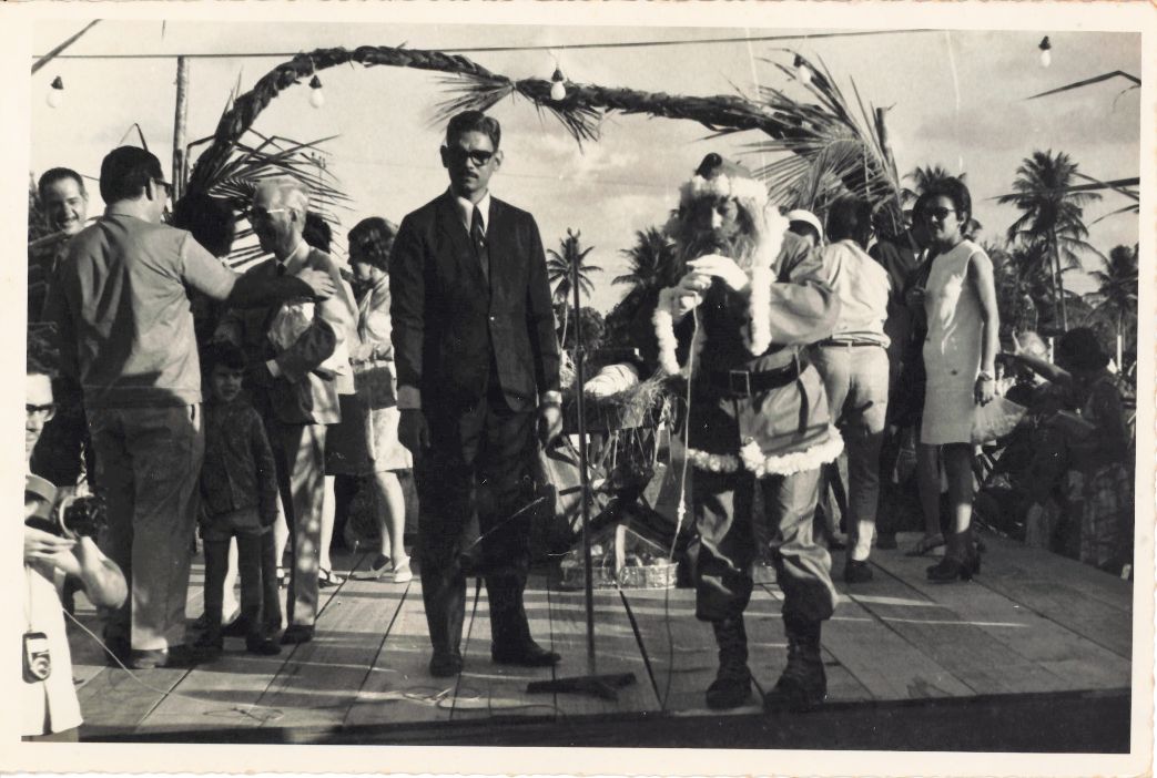 Foca a continuação da celebração do Natal no campus da UFRPE, vendo-se o tablado montado sobre a grama do campo de futebol existente defronte ao prédio da reitoria da universidade, decorado festivamente e repleto de pessoas entre as quais pode-se ver o professor Adierson Erasmo de Azevedo, reitor da UFRPE, que olha para o fotógrafo; de perfil, encontra-se o professor João de Vasconcelos Sobrinho que conversa com o professor João Baptista Oliveira dos Santos que está de costas para a câmera e, ao seu lado esquerdo, vê-se o professor Paulo de Moraes Marques, o mencionado trio de docentes conversa animadamente. No cento do palco, ao lado do reitor, está o papai Noel falando ao microfone. No ângulo direito da fotografia há uma mulher trajando vestido branco olhando para o papai Noel. No ângulo inferior esquerdo da fotografia, aparece outro fotógrafo segurando uma câmera fotográfica. Durante a entrevista para rememoração, ao observar a fotografia, o reitor Adierson falou: “As comemorações natalinas com os professores, servidores e estudantes eram sempre muito animadas... O papai Noel fazia o maior sucesso com a garotada!”. FONTES DE PESQUISA: Entrevista concedida às bibliotecárias Conceição Martins e Vania Ferreira para atender aos objetivos do Repositório Institucional, projeto “(Re) Memórias da UFRPE”, para a contextualização das imagens do acervo fotográfico do reitorado do Prof. Dr. Adierson Erasmo de Azevedo, no período de dezembro de 1969 a agosto de 1973. Acervo localizado no Núcleo do Conhecimento Professor João Baptista Oliveira dos Santos , da Biblioteca Central da UFRPE. Entrevista realizada no dia 04 de maio de 2016, no setor de Normalização da Biblioteca Central da UFRPE. Duração de 2h32min22seg, com transcrição e pesquisa complementar da bibliotecária Conceição Martins.