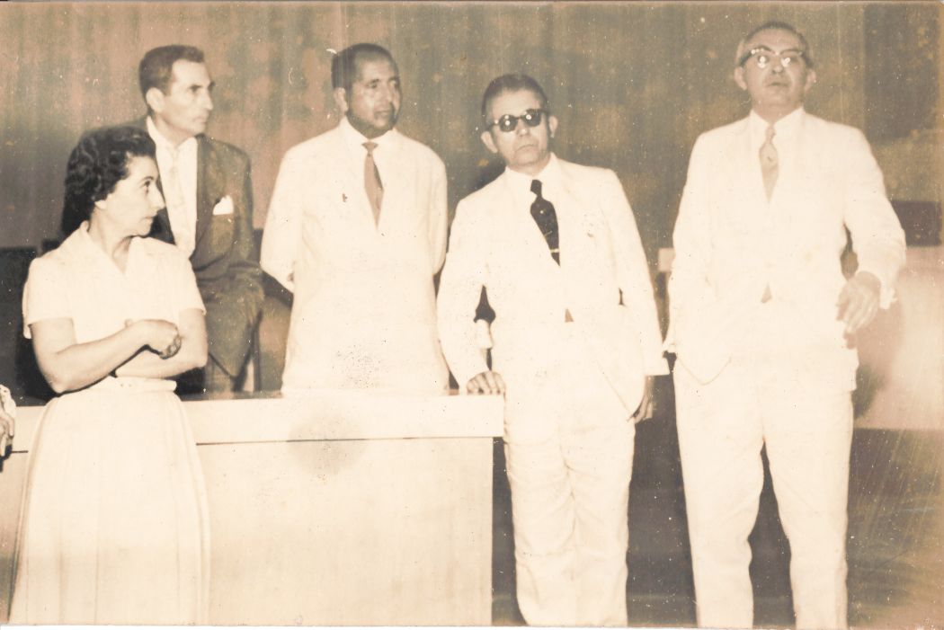 A imagem revela o reitor Manuel Rodrigues Filho durante reunião com assessores no salão nobre da Universidade Rural de Pernambuco (URP). Como não possui uma data especificada adotou-se o ano de 1960 como a data em que foi registrada. Fazem parte do grupo no degrau acima, o reitor Manuel Rodrigues Filho que aparece no ângulo direito da fotografia, tendo ao seu lado direito o professor Mário Bezerra de Carvalho, no centro encontra-se o professor Renato Ramos de Farias e ao seu lado direito, o professor João de Deus de Oliveira Dias. No degrau abaixo, encontra-se a secretária da reitoria, Senhora Hilda Margarida de Souza Leão Pinto. Coincidentemente quatro deles usam roupas brancas, apenas o professor João de Deus de Oliveira Dias, traja terno completo em cor escura com camisa branca, gravata de cor clara e lenço branco no bolso esquerdo do paletó. FONTES DE PESQUISA: UNIVERSIDADE RURAL DE PERNAMBUCO. Plaquete comemorativa do cinquentenário da Escola Superior de Agricultura da Universidade Rural de Pernambuco: 1912-1962. Recife: Imprensa Universitária URP, 1962; ______. Plaquete oitenta anos dos cursos das Ciências Agrárias: 1912-1992. Recife: Imprensa Universitária URP, 1994. PESQUISA COMPLEMENTAR: KOSSOY, Bóris. A fotografia como fonte histórica: introdução à pesquisa e interpretação das imagens do passado. São Paulo: Secretaria de Indústria e Comércio, 1985.