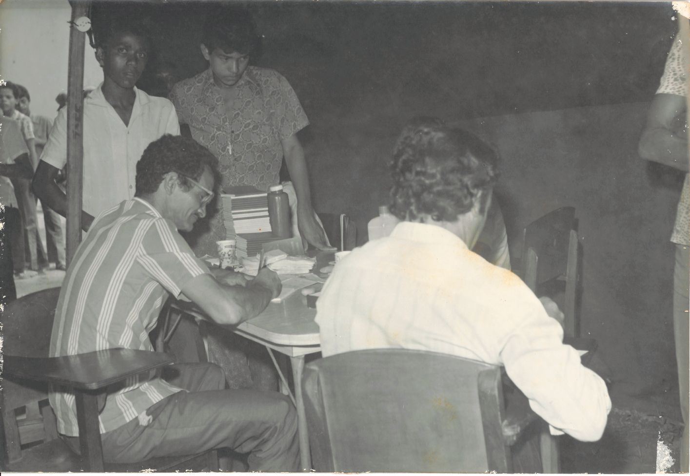 Revela a emissão de Carteiras de Trabalho durante a Jornada Universitária realizada em Salgueiro, Pernambuco. Como não possui uma data especificada adotamos o ano de 1971 como a data em que foi registrada. A fotografia apresenta uma barraca de lona onde se encontra sentado a uma mesa e praticamente não aparece, há um dos membros da Jornada atendendo dois homensque estão sentados, um deles aparece de lado e o outro, está de costas enquanto preenchem documentos necessários para a emissão das carteiras profissionais. Vê-se dois jovens de pé aguardando atendimento, um deles olha diretamente para a câmera fotográfica, enquanto o outro observa o membro da Jornada que está coordenando essa ação. Sobre a mesa além de uma pilha de carteiras que aguardam o preenchimento, há outros papéis, lápis e outros equipamentos. No ângulo direito da fotografia observa-se a presença de um homem não identificado, que está de pé. Durante a entrevista para rememoração, ao observar a fotografia, o reitor Adierson falou: “Essa foi uma ação social muito importante que a Jornada Universitária possibilitou à comunidade de Salgueiro”. FONTES DE PESQUISA: Entrevista concedida às bibliotecárias Conceição Martins e Vania Ferreira para atender aos objetivos do Repositório Institucional, projeto “(Re) Memórias da UFRPE”, para a contextualização das imagens do acervo fotográfico do reitorado do Prof. Dr. Adierson Erasmo de Azevedo, no período de dezembro de 1969 a agosto de 1973. Acervo localizado no Núcleo do Conhecimento Professor João Baptista Oliveira dos Santos, da Biblioteca Central da UFRPE. Entrevista realizada no dia 04 de maio de 2016, no setor de Normalização da Biblioteca Central da UFRPE. Duração de 2h32min22seg. com transcrição e pesquisa complementar da bibliotecária Conceição Martins.