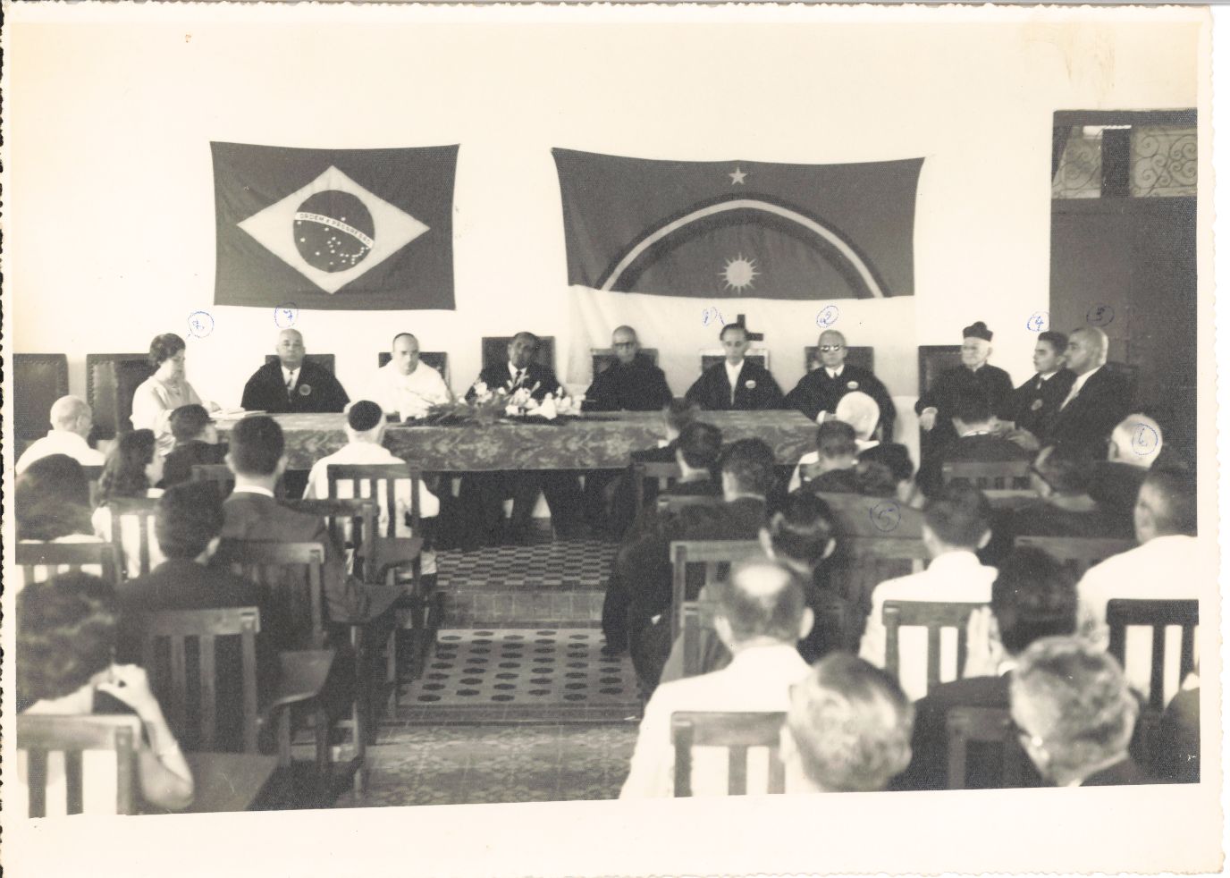 Revela a Solenidade comemorativa do Jubileu de Ouro da Escola Superior de Agricultura da Universidade Rural de Pernambuco - URP, realizada nas antigas instalações da Escola Superior de Agricultura - ESA, localizada nas instalações do Engenho São Bento, no município de São Lourenço da Mata, Pernambuco, em 03 de novembro de 1962. A equipe do reitorado do professor Renato Ramos de Farias coordenou e realizou as festividades que emocionaram a comunidade universitária e os Monges Beneditinos que propiciaram os primeiros passos dessa Instituição de Ensino Superior. Para fazer esse clique fotográfico com a finalidade de guardar para a posteridade, o fotógrafo se posicionou no início do salão, de frente para a mesa diretora da solenidade devidamente ornamentada com toalha e arranjo floral, composta pelo professor Renato Ramos de Farias, sentado no centro, vestindo a beca, veste talar ou traje oficial própria da vestimenta do Cerimonial Universitário, usado pelo reitor nas solenidades oficiais. No ângulo lateral esquerdo da fotografia, encontra-se o Dom Pedro Penido O.S.B., Abade do Mosteiro de São Bento de Olinda, Pernambuco, vestindo sua batina branca, traje usado nas cerimônias oficiais. Ao seu lado direito, encontra-se o professor Humberto Venet, diretor da Escola Superior de Medicina Veterinária, trajando terno e camisa brancos com gravata escura, usa óculos e sobre esse traje usa a beca, vestimenta do Cerimonial Universitário, usado pelos conselheiros nas solenidades oficiais. À sua esquerda, está sentada a senhora Maria de Lourdes Penante Neiva, secretária da Reitoria. No ângulo lateral direito, aparece sentado o professor João de Vasconcelos Sobrinho, docente da ESA, vestindo terno e camisa brancos com gravata poá, usa óculos e sobre esse traje usa a beca, vestimenta do Cerimonial Universitário, usado pelos conselheiros nas solenidades oficiais e tem nas mãos seu discurso, contudo, fala naturalmente e de improviso. Vê-se também sentado ao seu lado direito, Dom Pedro Bandeira de Melo, O.S.B., professor e ex-diretor da ESA, sobre a batina, usa a beca, vestimenta do Cerimonial Universitário, usado pelos conselheiros nas solenidades oficiais e está com as mãos cruzadas e usa óculos. Ainda nesse ângulo lateral direito da fotografia, ao lado esquerdo do professor João de Vasconcelos Sobrinho, está sentado o professor Mário Bezerra de Carvalho, usando terno e camisa brancos com gravata escura, usa óculos e sobre esse traje usa a beca, vestimenta do Cerimonial Universitário, usado pelos conselheiros nas solenidades oficiais. Ainda nesse mesmo ângulo, encontra-se sentada uma autoridade eclesiástica vestindo batina também chamada sotaina escura e sobre a cabeça um barrete. A seguir está sentado o professor Jair Meirelles, ao seu lado está sentado o professor Augusto Chaves Batista, ambos também usam a beca, vestimenta do Cerimonial Universitário, usado pelos conselheiros nas solenidades oficiais. Em seguida ao registro de todos os membros da mesa diretora, a objetiva captou parte do auditório que estava de costas para ele. Vê-se no ângulo lateral direito uma porta escura fechada, em cuja parte superior há uma grade antiga trabalhada. Vê-se presas à parede posterior aos membros da mesa diretora, a bandeira do Brasil e a bandeira de Pernambuco. NOTA IMPORTANTE: As Escolas Superiores de Agricultura e Veterinária São Bento, idealizadas pelo Abade D. Pedro Rooser O.S.B. e demais Monges Beneditinos do Mosteiro de São Bento, localizado em Olinda, Pernambuco, foram fundadas em 03 de novembro de 1912. Instaladas, inicialmente, no prédio anexo ao Mosteiro, iniciaram as aulas do primeiro semestre dos cursos de Agronomia e Veterinária no dia 1º de fevereiro de 1914. Em 1917, a Escola de Agricultura em virtude da necessidade de áreas para aulas práticas e campos de cultura, foi renomeada para Escola de Agronomia “São Bento” - ESA e transferida para o interior do Estado, passado a funcionar no Engenho São Bento, de propriedade da Ordem Beneditina da Ordem Beneditina, localizado no município de São Lourenço da Mata a oito quilômetros da Estação Tapera. Enquanto isso, a Escola Superior de Veterinária, continuou funcionando, ao lado do Mosteiro, em Olinda, contudo em virtude da falta de demanda, deixou de funcionar em 1926. Ambas as Escolas são a célula Mater da Universidade Federal Rural de Pernambuco - UFRPE. FONTE DE PESQUISA: Informações escritas a caneta no verso da fotografia; PESQUISA COMPLEMENTAR: BURKE, Peter. Testemunha ocular: o uso de imagens como evidência histórica. São Paulo: Editora Unesp, 2017; GOMES, Simone. Cerimonial da UFRPE. Depoimento oral concedido à bibliotecária Conceição Martins em 15 de setembro de 2023; UNIVERSIDADE RURAL DE PERNAMBUCO. Plaquete comemorativa do cinquentenário da Escola Superior de Agricultura da Universidade Rural de Pernambuco: 1912-1962. Recife: Imprensa Universitária URP, 1962; ______. Plaquete oitenta anos dos cursos das Ciências Agrárias: 1912-1992. Recife: Imprensa Universitária URP, 1994.