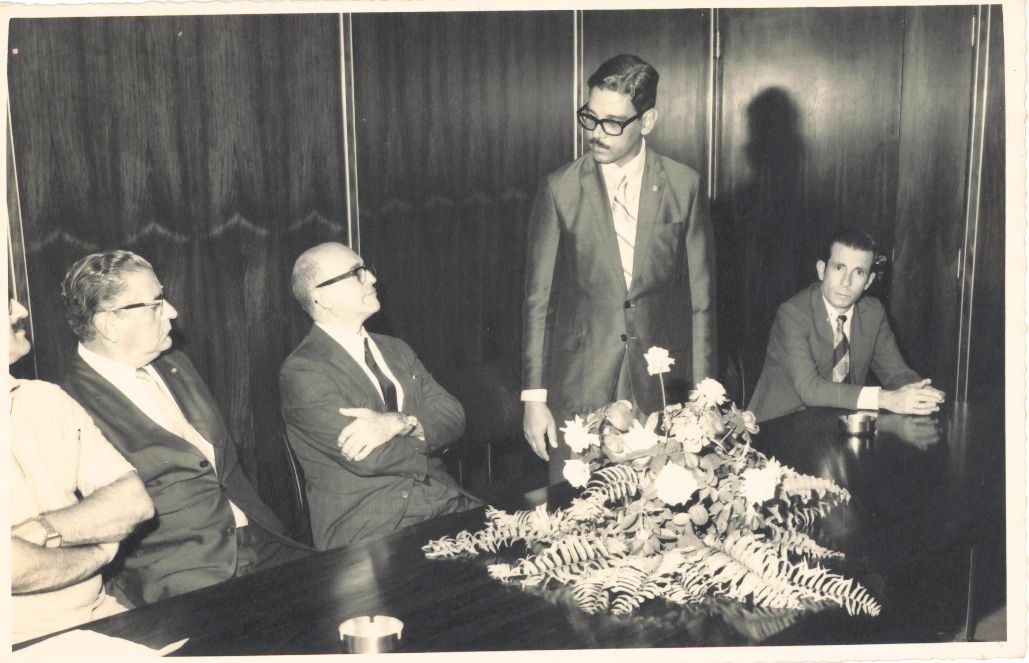 Retrata a sequência da visita do prefeito da Cidade do Recife, senhor Augusto da Silva Lucena, à UFRPE no dia 20 de julho de 1971, cujo mandato na Prefeitura Municipal do Recife há via iniciado naquele ano e se estenderia até 1975, sendo recebido pelo professor Adierson Erasmo de Azevedo, reitor da UFRPE na sala dos Conselhos Superiores da Universidade. Vê-se o reitor saudando o prefeito e sua comitiva que ocupa a mesa das autoridades onde também se encontram alguns professores, entre eles o professor Cláudio Selva. Nas cadeiras, vê-se outras pessoas que aparecem de costas. Durante a entrevista para rememoração, ao observar a fotografia, o reitor Adierson falou: “Vejo aqui na mesa, Potiguar Matos, reitor a UNICAP, ao seu lado o Prefeito Augusto Lucena, eu e Cláudio Selva... quem mais meu Deus? ... Bom.... Não lembro. E infelizmente no verso não tem alguma informação...” FONTES DE PESQUISA: Entrevista concedida às bibliotecárias Conceição Martins e Vania Ferreira para atender aos objetivos do Repositório Institucional, projeto “(Re) Memórias da UFRPE”, para a contextualização das imagens do acervo fotográfico do reitorado do Prof. Dr. Adierson Erasmo de Azevedo, no período de dezembro de 1969 a agosto de 1973. Acervo localizado no Núcleo do Conhecimento Professor João Baptista Oliveira dos Santos, da Biblioteca Central da UFRPE. Entrevista realizada no dia 27 de abril de 2016, no Espaço Santander da Biblioteca Central da UFRPE. Duração de 2h17min com transcrição e pesquisa complementar da bibliotecária Conceição Martins.