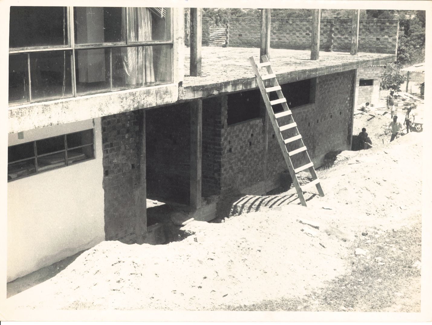 Registra a vista parcial da obra de reforço do alicerce e da construção do pavimento superior no 1º bloco da ala esquerda do prédio da reitoria da UFRPE, construção das salas de Desenho e Matemática no 1º andar e das instalações da Imprensa Universitária no térreo, realizada em 1969. Vê-se, parcialmente, os janelões do 1º andar onde se localiza a reitoria, as escavações ao longo do prédio cujas paredes aparecem sem o revestimento. Observa-se uma escada recostada e mais adiante um grupo de 04 trabalhadores da construção civil em seu trabalho. Durante a entrevista para rememoração, ao observar a fotografia, o reitor Adierson falou: “Perfeito! (Observando...) Foi uma renovação total no campus...” FONTES DE PESQUISA: Entrevista concedida às bibliotecárias Conceição Martins e Vania Ferreira para atender aos objetivos do Repositório Institucional, projeto “(Re) Memórias da UFRPE”, para a contextualização das imagens do acervo fotográfico do reitorado do Prof. Dr. Adierson Erasmo de Azevedo, no período de dezembro de 1969 a agosto de 1973. Acervo localizado no Núcleo do Conhecimento Professor João Baptista Oliveira dos Santos, da Biblioteca Central da UFRPE. Entrevista realizada no dia 29 de abril de 2016, no Espaço Santander da Biblioteca Central da UFRPE. Duração de 2h24min com transcrição e pesquisa complementar da bibliotecária Conceição Martins.