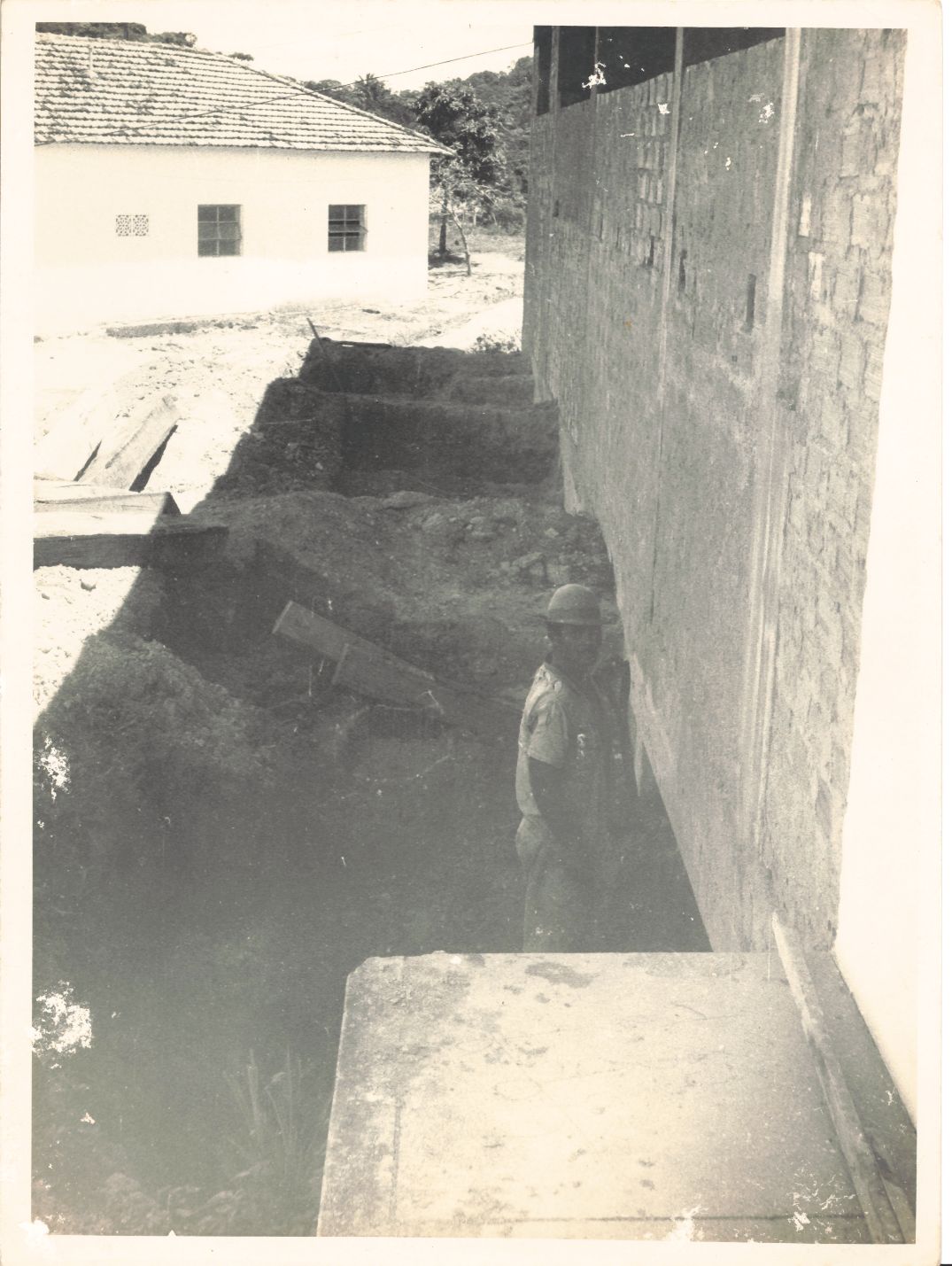 Esta fotografia clicou outro ângulo da obra de reforço do alicerce e da construção do pavimento superior no 1º bloco da ala esquerda do prédio da reitoria da UFRPE, realizada em 1969. Vê-se, 01 trabalhador anônimo da construção civil ao lado das escavações e da parede do novo prédio ainda sem revestimento, olhando diretamente para o fotógrafo. Observa-se nesse local, restos de madeiras e mais adiante uma casa não identificada. Durante a entrevista para rememoração, ao observar a fotografia, o reitor Adierson falou:“Hum!... Essa casa não era o restaurante... (Observando) ... naquele tempo tinha algumas construções, moradias de professores e alguns servidores... não lembro que prédio era esse.” FONTES DE PESQUISA: Entrevista concedida às bibliotecárias Conceição Martins e Vania Ferreira para atender aos objetivos do Repositório Institucional, projeto “(Re) Memórias da UFRPE”, para a contextualização das imagens do acervo fotográfico do reitorado do Prof. Dr. Adierson Erasmo de Azevedo, no período de dezembro de 1969 a agosto de 1973. Acervo localizado no Núcleo do Conhecimento Professor João Baptista Oliveira dos Santos, da Biblioteca Central da UFRPE. Entrevista realizada no dia 29 de abril de 2016, no Espaço Santander da Biblioteca Central da UFRPE. Duração de 2h24min com transcrição e pesquisa complementar da bibliotecária Conceição Martins.