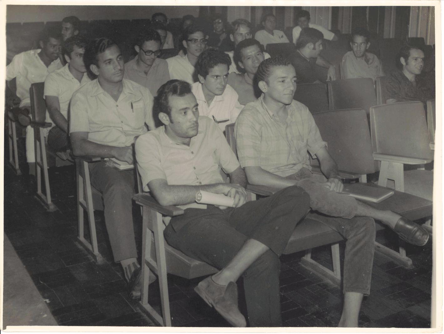Clique relativo à participação dos alunos do curso de Agronomia durante evento no salão nobre da UFRPE. No verso da fotografia estão registrados os nomes de Rubens Barros Costa e Neidson da Silveira Jatobá, contudo, identificou-se apenas a turma do aluno Rubens Barros Costa da turma de 1971 , enquanto que a turma do aluno Neidson da Silveira Jatobá não foi identificada. Durante a entrevista para rememoração, ao observar a fotografia, o reitor Adierson falou: “Rubens... Está uma foto meio apagada... (Observando) ...Não lembro da turma de Rubens... Não dá para lembrar os nomes porque eram muitos alunos.”FONTES DE PESQUISA: Entrevista concedida às bibliotecárias Conceição Martins e Vania Ferreira para atender aos objetivos do Repositório Institucional, projeto “(Re) Memórias da UFRPE”, para a contextualização das imagens do acervo fotográfico do reitorado do Prof. Dr. Adierson Erasmo de Azevedo, no período de dezembro de 1969 a agosto de 1973. Acervo localizado no Núcleo do Conhecimento Professor João Baptista Oliveira dos Santos, da Biblioteca Central da UFRPE. Entrevista realizada no dia 29 de abril de 2016, no Espaço Santander da Biblioteca Central da UFRPE. Duração de 2h24min com transcrição e pesquisa complementar da bibliotecária Conceição Martins. A pesquisa complementar revelou que o aluno Rubens Barros Costa foi concluinte da turma de 1971. Fonte: UNIVERSIDADE FEDERAL RURAL DE PERNAMBUCO. 80 anos dos cursos de ciências agrárias: 1912- UFRPE – 1992. Recife: Editora da UFRPE, 1994.