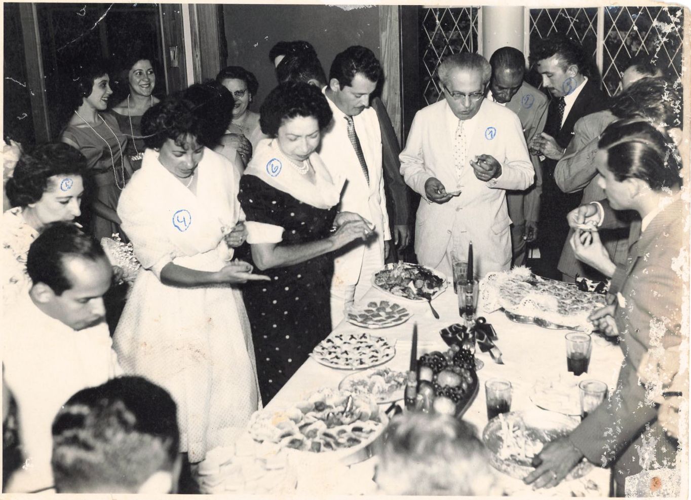 Registra a recepção oferecida pelo reitor Manuel Rodrigues Filho em sua residência, à turma de concluintes do Curso de Medicina Veterinária do ano de 1959, que o homenageou com a escolha do seu nome para Paraninfo. A turma de 1959 era composta pelos seguintes alunos: Ariovaldo Torres, Geraldo Andrade Teixeira, Geraldo Fernando Saboya, Herman de Moreira Albuquerque, José Cassemiro de Lima Albuquerque, João Fernando de Carvalho, Joaquim Berdor Jardim, Leônidas Espírito Santos Saraiva, Moysés Castanha Accioly, Nélson Dutra Buarque, Onildo Travassos de Medeiros, Pedro Chaves Nunes, Rosael Paes Barreto Pereira e Valfredo Cordeiro de Albuquerque. Na fotografia não foi possível identificar nenhum deles. Vê-se o reitor, professores, servidores, convidados e formandos, todos diante de uma mesa ricamente ornamentada, era época natalina, contendo diversos pratos doces, salgados e frutas. O reitor trajando branco serve-se, tendo ao lado os professores Artur Lopes e Saboia. Na lateral esquerda da mesa estão as senhoras: Dagmar Siqueira de Carvalho, secretária da Escola Superior de Medicina Veterinária, trajando vestido de poá, cabelos curtos, completam o mesmo uma gola branca e um colar de pérolas com três voltas, ao seu lado, encontra-se a professora Maria Celene Cardoso, diretora da Escola de Economia Doméstica, usando vestido branco, colar de pérolas e cabelos curtos, finalmente, a secretaria da reitoria, Hilda Magariños de Souza Leão que aparece parcialmente, usando traje estampado e cabelos curtos. Todas olham para os quitutes. Atrás das mesmas vê-se duas mulheres não identificadas usando vestidos escuros e colares de pérolas, ambas sorriem. Aparecem, parcialmente, duas mulheres, uma de costas, outra de frente sorrindo e dois homens, todos não identificados. FONTES DE PESQUISA: BOLETIM DA UNIVERSIDADE RURAL DE PERNAMBUCO. Recife: Imprensa da Universidade Rural e Pernambuco, n. 9, 1959. Trimestral; UNIVERSIDADE FEDERAL RURAL DE PERNAMBUCO. Plaquete comemorativa dos oitenta anos dos cursos de Ciências Agrárias: 1912-1992. Recife: UFRPE, 1994. PESQUISA COMPLEMENTAR: KOSSOY, Bóris. A fotografia como fonte histórica: introdução à fotografia e interpretação das imagens do passado. São Paulo: Museu da Indústria, Comércio e Tecnologia, 1980; ____. Fotografia e história. São Paulo: Ática, 1998.
