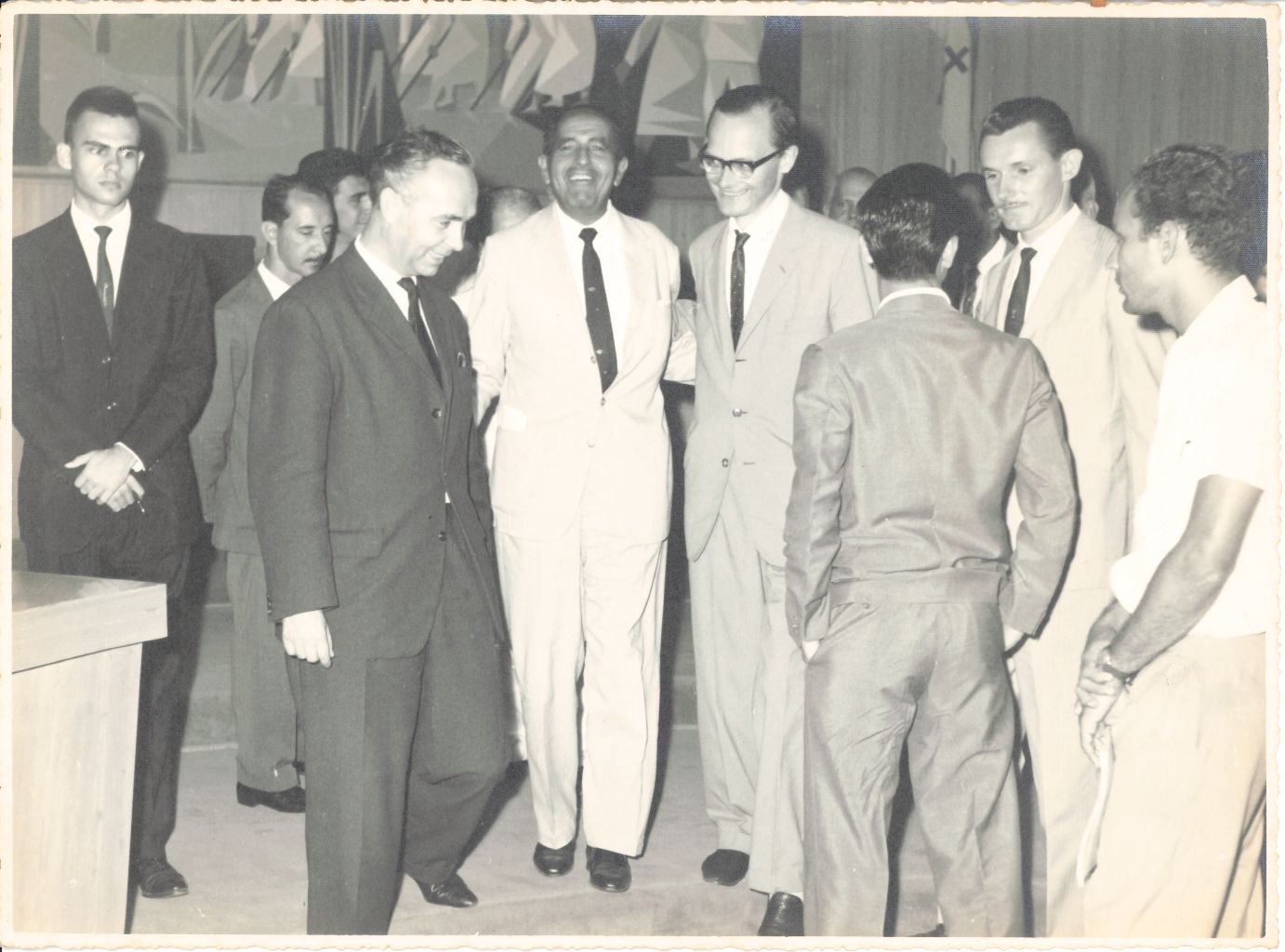 Fotografia que marca o oitavo momento do encontro entre o reitor Renato Ramos de Farias, a comitiva de professores da Escola de Medicina Veterinária da Universidade de Hanover – Alemanha, que estiveram em visita à UFRPE e professores desta universidade. Esse registro ocorreu ao final da palestra realizada no salão nobre, proferida por um professor alemão visitante. Observa-se que o referido grupo ainda se encontra no recinto do aludido salão, vendo-se o reitor Renato Ramos de Farias, trajando terno claro, camisa branca e gravata preta, tendo ao seu lado direito, um professor alemão usando terno de cor clara, gravata escura e óculos e, ao lado esquerdo, o outro professor alemão, vestindo terno escuro, camisa branca e gravata escura que havia acabado de proferir a palestra. Importante registrar que não foi encontrada informação relativa aos nomes desses visitantes. Vê-se também a presença de outros docentes da UFRPE, entre eles: o professor Humberto Vernet, diretor da Escola Superior de Medicina Veterinária da UFRPE que aparece parcialmente atrás do professor alemão que está à direita do reitor e os professores Artur Lopes, Edvaldo Saldanha, Almir Pires Ferreira e Sílvio Camerino Paes Barretto. Vê-se também parte da parede em lambri de madeira que segue na parede que surge no ângulo lateral direito da fotografia na qual vê-se hasteada a bandeira de Pernambuco. É possível observar ainda o nicho onde se encontra o painel de autoria do artista plástico pernambucano Lula Cardoso Ayres, o qual aparece parcialmente e ornamenta o ambiente do salão nobre, atendendo o convite do Reitor Manoel Rodrigues Filho, após ouvir a história da Universidade, o artista em 1957 criou essa obra de arte que representa as áreas geográficas de Pernambuco: o litoral, a zona da mata, o agreste e o sertão, todas retratando cenas que refletem a alma nordestina, de vidas ligadas à agricultura e à pecuária. FONTE DE PESQUISA: Informações escritas a lápis no verso da fotografia. PESQUISA COMPLEMENTAR: BURKE, Peter. Testemunha ocular: o uso de imagens como evidência histórica. São Paulo: Editora Unesp, 2017; KOSSOY, Boris. O encanto de Narciso: reflexões sobre a fotografia. São Paulo: Ateliê intelectual, 2020; LE GOFF, Jacques. Documento/Monumento. In:_____. História e memória. Campinas: UNICAMP, 2003. p. 525-54; UNIVERSIDADE FEDERAL RURAL DE PERNAMBUCO. Plaquete comemorativa dos setenta anos de Medicina Veterinária em Pernambuco: (1912-1982). Recife: UFRPE, 1982; ______. Plaquete oitenta anos dos Cursos de Ciências Agrárias: (1912-1992). Recife: UFRPE, 1992.