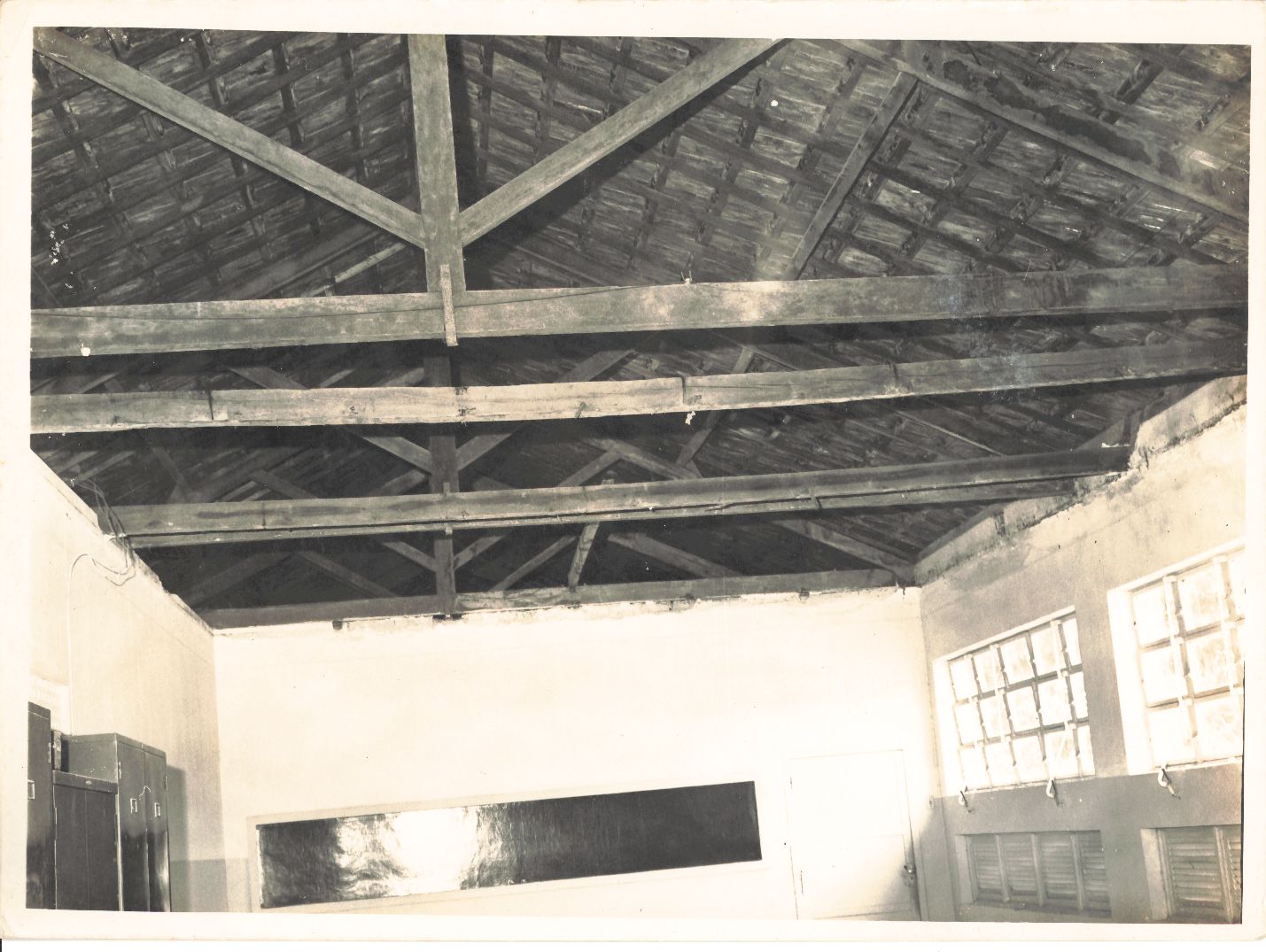 Registra nova vista parcial do teto da sala do Departamento de Física necessitando da substituição do estuque no campus da UFRPE, dessa feita realizada em 28 de setembro de 1971. Observa-se que a imagem foi clicada em outro ângulo e mostra uma parede com janelões de cobogós fechados. Na parede final, há um quadro de giz. Na outra parede, encontram-se armários antigos fechados. Mostra o teto, suas vigas em madeira e o telhado sem estuque aguardando substituição e conserto. Durante a entrevista para rememoração, ao observar a fotografia, o reitor Adierson falou: “Duas fotos da mesma sala... (Observando...) ... Vejo que apesar de serem do mesmo espaço, cada uma delas traz detalhes diferentes... Hum! ... A foto anterior além do estuque mostrava alguns móveis no final da sala. Enquanto esta foto foca apenas o estuque.... É, a universidade precisava de serviços de restauração. ” FONTES DE PESQUISA: Entrevista concedida às bibliotecárias Conceição Martins e Vania Ferreira para atender aos objetivos do Repositório Institucional, projeto “(Re) Memórias da UFRPE”, para a contextualização das imagens do acervo fotográfico do reitorado do Prof. Dr. Adierson Erasmo de Azevedo, no período de dezembro de 1969 a agosto de 1973. Acervo localizado no Núcleo do Conhecimento Professor João Baptista Oliveira dos Santos, da Biblioteca Central da UFRPE. Entrevista realizada no dia 29 de abril de 2016, no Espaço Santander da Biblioteca Central da UFRPE. Duração de 2h24min com transcrição e pesquisa complementar da bibliotecária Conceição Martins.