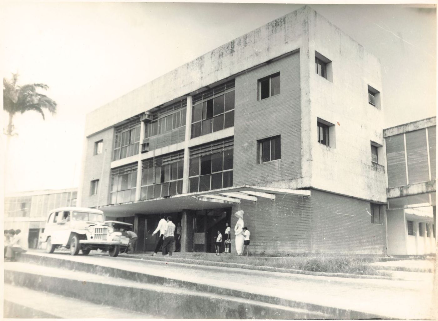 Apresenta a fachada do conjunto arquitetônico projetado pelo arquiteto carioca Luiz Nunes na década de 1930. Sua mudança do Rio de Janeiro para o Recife atendeu ao convite do então Interventor de Pernambuco, Carlos de Lima Cavalcanti, que na época, para subsidiar seu discurso e enfatizar a urgência da urbanização e da modernidade, convidou profissionais de áreas diversas para integrar seu staff. Nesse contexto, a ideia modernizadora da arquitetura aconteceu na sociedade recifense na pessoa e nos projetos de Luiz Nunes ao dirigir a diretoria de Obras Públicas e, junto com sua equipe, tornou-se o responsável pela implantação da arquitetura moderna em Pernambuco. No ano de 1934, entre os trabalhos de modernização, lhe foi solicitado o projeto do Reformatório de Menores a ser construído em Dois Irmãos, com a finalidade de “retirar do centro” as crianças e adolescentes que moravam nas ruas, vivendo à beira da desagregação social. Projeto concluído, foi construído pelo engenheiro civil Gerson Carneiro Leão em 1935. Pensado originariamente para atuar como Reformatório, dois anos depois, o conjunto arquitetônico foi modificado por Luíz Nunes e sua equipe, para atender às necessidades da Escola Superior de Agricultura de Pernambuco (ESAP), criada em 1936 pelo Governador Carlos de Lima Cavalcanti que seria transferida em 1938 do Engenho São Bento, em Tapera, Pernambuco, para Dois Irmãos, no Recife. A reforma e adaptação do prédio obedeceram ao projeto original mantendo o bloco central e as alas laterais como continuam até a atualidade. As alterações aconteceram nas divisões internas a fim de adaptar os espaços para efeito da nova ordem, a Escola, e não mais para o Reformatório. Em 1956, o então reitor Manuel Rodrigues Filho, reconhecendo o valor do prédio e tendo em vista as necessidades de nova ampliação, trouxe o arquiteto Waldecy Fernandes Pinto, da UFPE, para realizar a primeira reforma como marco da sua gestão universitária. Observando a fotografia, vê-se diante do citado conjunto, dois veículos utilitários estacionados em sentidos diferentes, duas Rurais Willis antigas, de anos não identificados, produzidas pela Ford do Brasil. Observa-se também uma pessoa não identificada próxima a um desses veículos, varrendo a calçada, há ainda dois homens não identificados passando diante das portas de acesso ao prédio. Tem ainda outro homem não identificado encostado em uma das colunas centrais. Vê-se, por fim, três crianças também não identificadas ladeando a estátua da deusa Ceres que ornamenta a fachada do bloco central, conhecido também até os dias atuais como prédio da reitoria ou prédio central. No ângulo lateral esquerdo, vê-se três homens também não identificados sentados nos degraus de acesso ao campo de futebol localizado diante do mesmo. Nota importante: Para preservação e sem desvirtuar o projeto original diante da necessidade da nova estrutura funcional do uso do conjunto arquitetônico para fins de uma universidade, tendo em vista a ampliação dos espaços, pois a estrutura existente não mais atendia a demanda, foi necessário construir um pavimento superior para cada bloco, mantendo, no entanto, a escada helicoidal do bloco central que foi ampliado, no entanto, manteve-se a forma do conjunto dos prédios do jeito que estão distribuídos originalmente preservando-se a concepção dos blocos laterais isolados. Criou-se um novo espaço dedicado ao salão para as solenidades. Ao longo das décadas cada reitorado cuidou do mesmo e outras reformas foram necessárias para preservação dos princípios adotados em 1956 pelo arquiteto Waldecy Fernandes Pinto, também reitor no período de 1983-1987. Tal cuidado e preservação justificaram que esse conjunto arquitetônico viesse a se tornar um Imóvel Especial de Preservação (IEP), ocupando o nº 80, constante do Anexo I da Lei Ordinária nº 16.159 de 24 de janeiro de 1996 da Prefeitura Municipal do Recife. FONTES DE PESQUISA: PINTO, Waldecy Fernandes. Professor e Reitor da UFRPE no período de 1983-1987. Entrevistas concedidas a Conceição Martins e Maria do Rosário de Fátima Andrade Leitão, em 07 de julho e 15 de outubro de 2009; PRÉDIO Reitoria da UFRPE: resgate histórico 1935-2009. Recife: EDUFRPE, 2011. PESQUISA COMPLEMENTAR: PISANESCHI, PISANESCHI, Lucilene Schunck C.; BAUER, Viviane Freitas Carlos. A imagem da história: o uso da documentação iconográfica e historiográfica. São Paulo: Amazon & Independently published, 2021; PRÉDIO Reitoria da UFRPE: resgate histórico 1935-2009. Recife: UFRPE, 2009.