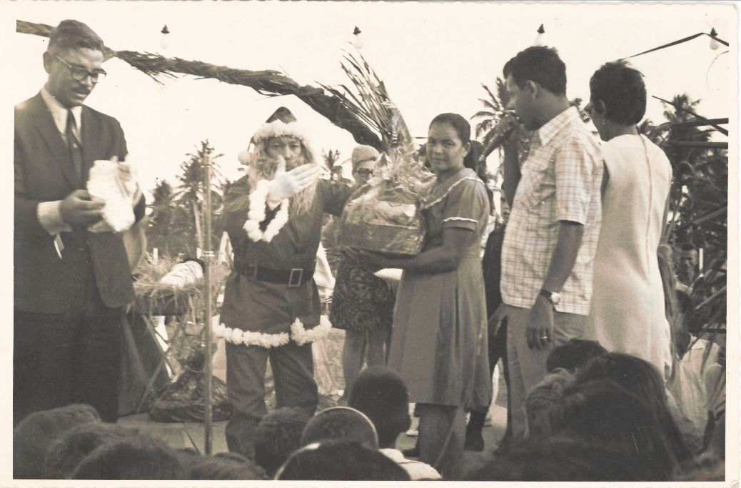 Revela a celebração do Natal no campus da UFRPE, vendo-se o tablado montado sobre a grama do campo de futebol existente defronte ao prédio da reitoria da universidade, decorado festivamente e repleto de pessoas entre as quais pode-se ver o professor Adierson Erasmo de Azevedo, reitor da UFRPE, que segura um saquinho com os números a serem sorteados. No ângulo posterior da fotografia observa-se a manjedoura com a representação do menino Jesus. No cento do palco, ao lado do reitor, está o papai Noel dirigindo aos presentes após entregar a cesta natalina a uma servidora. No ângulo direito da fotografia, aparece um homem falando ao microfone e ao seu lado uma mulher trajando vestido branco. Observa-se ainda no ângulo inferior da fotografia a presença de várias pessoas cujas cabeças estão visíveis. Durante a entrevista para rememoração, ao observar a fotografia, o reitor Adierson falou: “Ui lá lá era muita gente! Minha equipe sentia uma alegria danada em organizar essas comemorações natalinas porque eram sempre muito animadas... Tinha um culto e uma missa, depois o papai Noel chegava e fazia o maior sucesso com a garotada!”. FONTES DE PESQUISA: Entrevista concedida às bibliotecárias Conceição Martins e Vania Ferreira para atender aos objetivos do Repositório Institucional, projeto “(Re) Memórias da UFRPE”, para a contextualização das imagens do acervo fotográfico do reitorado do Prof. Dr. Adierson Erasmo de Azevedo, no período de dezembro de 1969 a agosto de 1973. Acervo localizado no Núcleo do Conhecimento Professor João Baptista Oliveira dos Santos, da Biblioteca Central da UFRPE. Entrevista realizada no dia 04 de maio de 2016, no setor de Normalização da Biblioteca Central da UFRPE. Duração de 2h32min22seg, com transcrição e pesquisa complementar da bibliotecária Conceição Martins.
