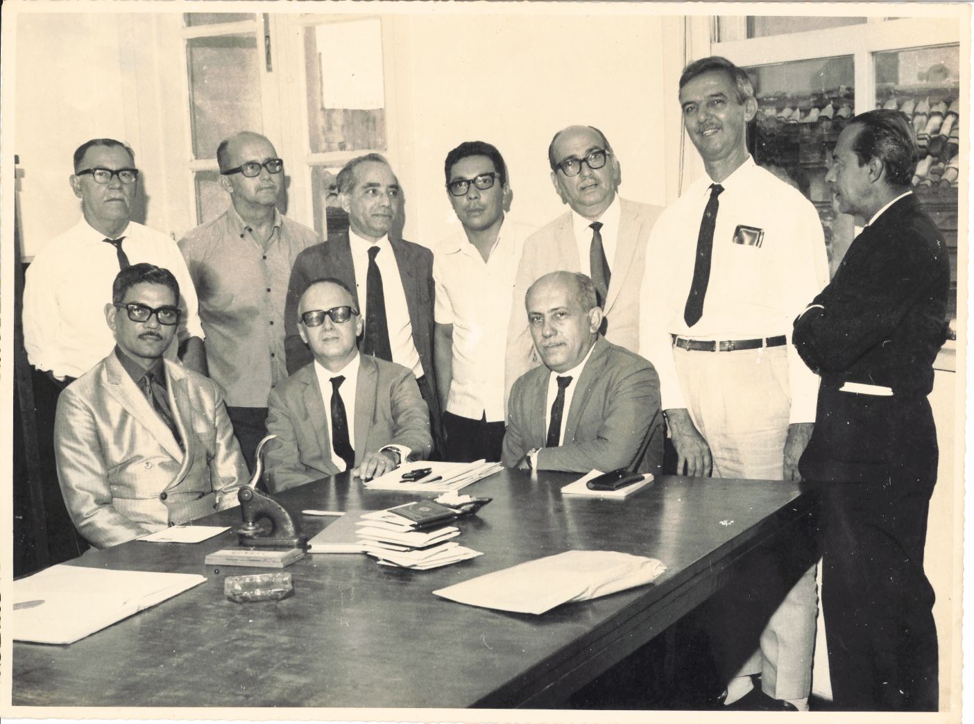 Registra o reitor Adierson Erasmo de Azevedo durante reunião de trabalho ao lado de 09 autoridades, sendo que 03 delas encontram-se sentadas, inclusive o reitor Adierson Erasmo de Azevedo. Aparecem de pé, os 07 restantes. Não traz nenhuma informação. Durante a entrevista para rememoração, o reitor Adierson observando a imagem murmurou: “Não dá para lembrar. Eu estou aqui... Não tem nada escrito... Essa não dá para identificar, infelizmente.” FONTES DE PESQUISA: Entrevista concedida às bibliotecárias Conceição Martins e Vania Ferreira para atender aos objetivos do Repositório Institucional, projeto “(Re) Memórias da UFRPE”, para a contextualização das imagens do acervo fotográfico do reitorado do Prof. Dr. Adierson Erasmo de Azevedo, no período de dezembro de 1969 a agosto de 1973. Acervo localizado no Núcleo do Conhecimento Professor João Baptista Oliveira dos Santos , da Biblioteca Central da UFRPE. Entrevista realizada no dia 15 de abril de 2016, no Espaço Santander da Biblioteca Central da UFRPE. Duração de 2h17min com transcrição e pesquisa complementar da bibliotecária Conceição Martins. AZEVEDO, Adierson Erasmo de. A “Caminhada seguindo o Sol” da Universidade Federal Rural de Pernambuco. Recife: Editora UFRPE, 2007.