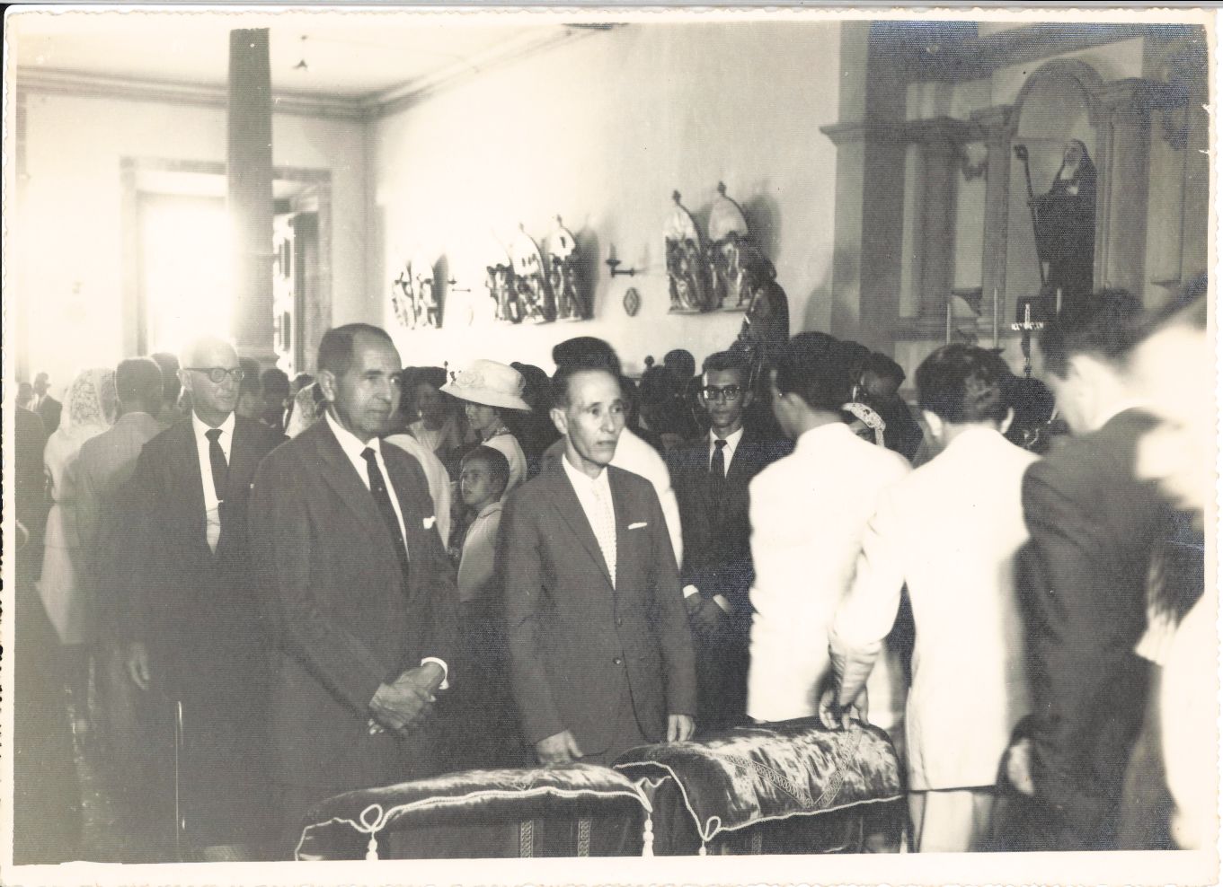 Registro da Missa em Ação de Graças pelo Cinquentenário e Jubileu de Ouro da Escola Superior de Agricultura de Pernambuco URP, realizada na igreja do Mosteiro de São Bento, Olinda, Pernambuco. A comunidade universitária da UFRPE e seus convidados participaram da missa, pode-se observar que nessa imagem, que o fotógrafo congelou para a posteridade o momento do final desse rito religioso, vendo-se sobre o primeiro banco do lado esquerdo da mencionada igreja, duas almofadas, diante das quais encontram-se o professor Renato Ramos de Farias, reitor da UFRPE, de pé, trajando terno escuro, camisa branca, gravata escura, lenço de bolso, com as mãos cruzada à sua frente, tendo ao seu lado direito, o professor João de Vasconcelos Sobrinho, usando terno escuro, camisa e grava claras, lenço de bolso, com os braços ao longo do corpo. Ambos olham para a frente onde se encontra o altar mor e para as pessoas que se retiram daquele espaço. No ângulo lateral direito da fotografia, vê-se o nicho com a imagem de uma santa e mais adiante na parede observa-se sete quadro relativos à Via Sacra. Observa-se, por fim, que uma multidão ocupa o espaço da igreja. No final da igreja vê-se uma porta aberta através da qual entram a luminosidade dos raios do sol. NOTA IMPORTANTE: As Escolas Superiores de Agricultura e Veterinária São Bento, idealizadas pelo Abade D. Pedro Rooser O.S.B. e demais Monges Beneditinos do Mosteiro de São Bento, localizado em Olinda, Pernambuco, foram fundadas em 03 de novembro de 1912. Instaladas, inicialmente, no prédio anexo ao Mosteiro, iniciaram as aulas do primeiro semestre dos cursos de Agronomia e Veterinária no dia 1º de fevereiro de 1914. Em 1917, a Escola de Agricultura em virtude da necessidade de áreas para aulas práticas e campos de cultura, foi renomeada para Escola de Agronomia “São Bento” - ESA e transferida para o interior do Estado, passado a funcionar no Engenho São Bento, de propriedade da Ordem Beneditina da Ordem Beneditina, localizado no município de São Lourenço da Mata a oito quilômetros da Estação Tapera. Enquanto isso, a Escola Superior de Veterinária, continuou funcionando, ao lado do Mosteiro, em Olinda, contudo em virtude da falta de demanda, deixou de funcionar em 1926. Ambas as Escolas são a célula Mater da Universidade Federal Rural de Pernambuco - UFRPE. FONTE DE PESQUISA: Informações escritas a caneta no verso da fotografia; PESQUISA COMPLEMENTAR: BURKE, Peter. Testemunha ocular: o uso de imagens como evidência histórica. São Paulo: Editora Unesp, 2017; GOMES, Simone. Cerimonial da UFRPE. Depoimento oral concedido à bibliotecária Conceição Martins em 15 de setembro de 2023; UNIVERSIDADE RURAL DE PERNAMBUCO. Plaquete comemorativa do cinquentenário da Escola Superior de Agricultura da Universidade Rural de Pernambuco: 1912-1962. Recife: Imprensa Universitária URP, 1962; ______. Plaquete oitenta anos dos cursos das Ciências Agrárias: 1912-1992. Recife: Imprensa Universitária URP, 1994.